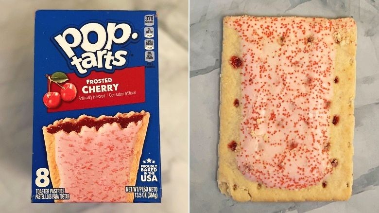 While the Frosted Cherry Pop-Tart box doesn't hide the fact that it is artificially flavored, even spelling it out below its flavor name, it does contain actual dried cherries, as well as dried apples. With a pretty pink frosting, and a ton of red specks covering it, it's almost as exciting to look at as it is to eat it.