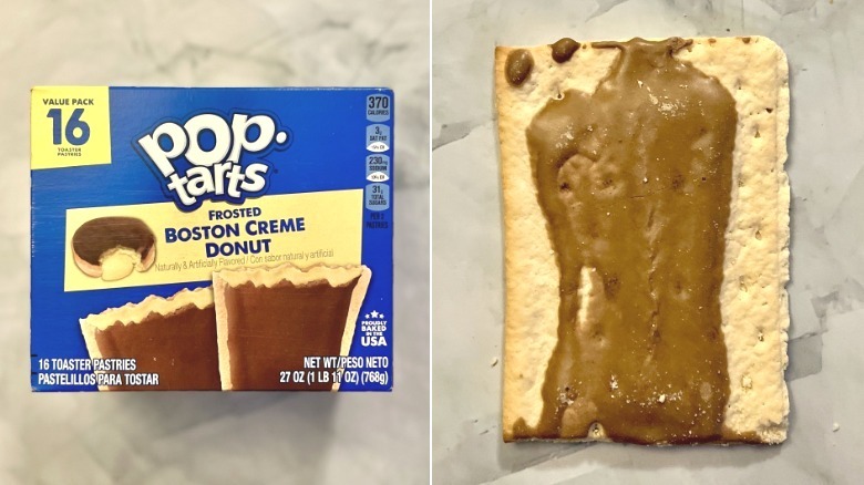 The Frosted Boston Creme Donut box shows the image of a bit-open donut with cream oozing it. The pastry is essentially doing the same but in rectangular form. The reality of the actual Pop-Tart isn't as pleasing. Not to be crass, but it looks like an unfrosted Pop-Tart was abandoned on a sidewalk, and along came a dog who did its business on top of it.