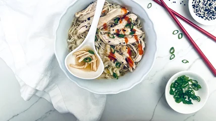 Despite this recipe's elevated approach to chicken noodle soup, you can still expect ease as you make it and comfort with every bite. "My favorite thing about this soup is how easy it is to make," Vergara says. "Plus, it is great when you are feeling like you are coming down with something — the ginger and Sriracha have a nice kick." Additional ingredients such as miso paste, tamari, and mirin help add umami depth to the broth, which pairs wonderfully with a bowlful of shredded chicken breast and hearty ramen noodles.