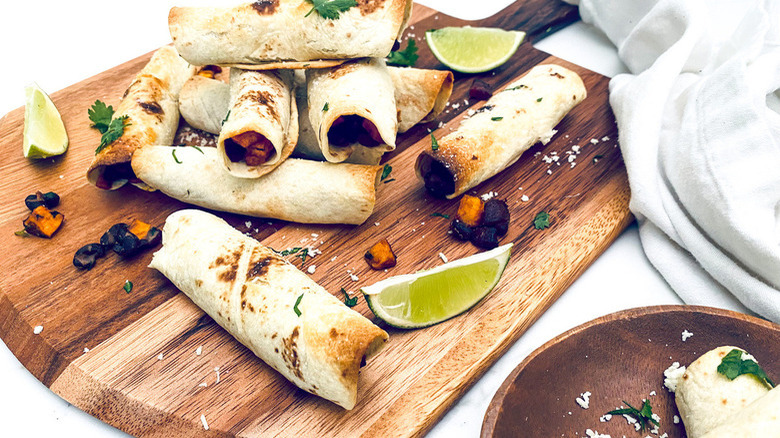 These delightful taquito appetizers have a lot going for them. First, they are baked instead of fried, giving them a golden crisp crust without the excess grease. They also take advantage of the earthy caramelized flavor of roasted beets and sweet potatoes. Whatever you do, do not use pickled beets. These do not have the flavor of steamed or baked beets.