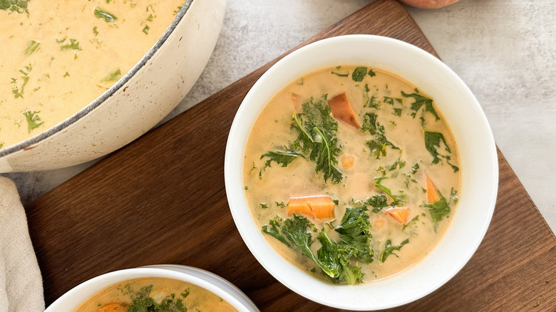 For those who fear kale, there is nothing to be scared of. Cutting the leaves into smaller pieces and cooking them will tenderize them. While they have a mild bitterness, this will be offset by the sweetness of coconut milk. If you are still concerned, use baby spinach leaves instead. Just remember they take less time to cook than kale.