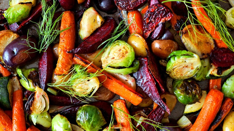 Roasted vegetables are easy to make, since all you need to do is cut up your favorite veggies, coat them in a little fat, and let the oven do the work. They're great for meal prep because they last a long time in the fridge and still taste great. You can even have some roasted veggies for dinner and save the rest for breakfast. All that's missing is a 3-minute poached egg to turn your leftovers into a vegetarian breakfast hash. If a slice of multigrain toast shows up to the party, all the better, but you really only need eggs and veggies to get your day started off on the right foot.
