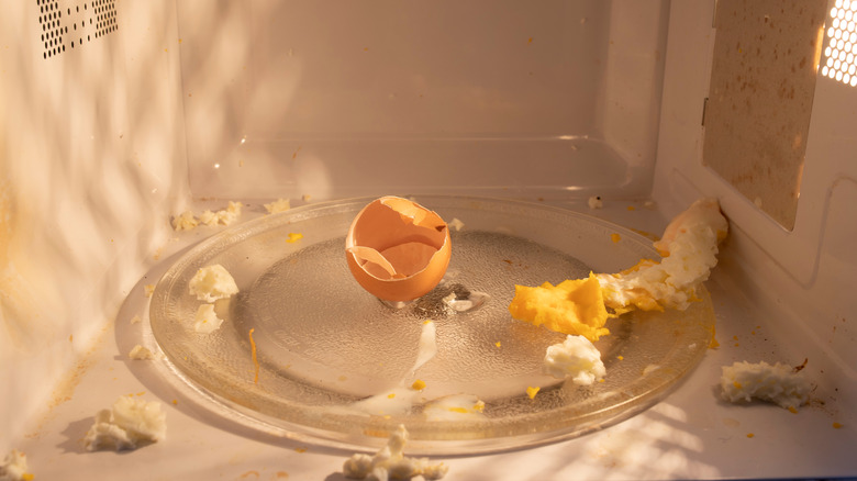 Here's the thing about eggs in the microwave: They overcook fast. Microwaves heat food, including eggs, so quickly thanks to their electromagnetic waves, which cause the water in the eggs to rise in temperature rapidly, resulting in them cooking. While this speed can be advantageous for getting your food on the table quickly, it also means that the cooking process can be way harder to control. This is exacerbated by the fact that because there's a microwave door between your eggs and yourself, it's harder to see how done they are.