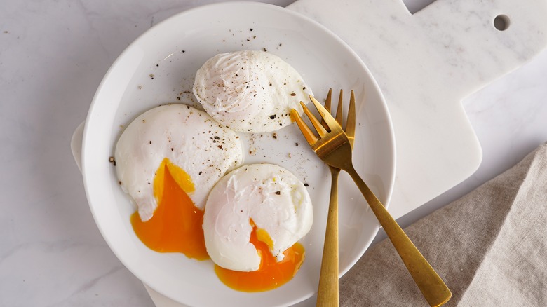 However, for the best poached eggs, do what celebrity chef Curtis Coles does, and add white vinegar (via YouTube). This isn't for flavor but for texture. As the Victoria University of Wellington's associate professor Robert Keyzers explains, "Vinegar is an inherently acidic material, so if we add a few drops of vinegar into that boiling water that is going to increase the rate of denaturing and it's going to make that happen faster and help the poached egg hold its shape better." In other words, the vinegar helps the outside of the egg white cook more quickly, binding it around the yolk more effectively and stopping it from spreading out around the pan. Importantly, you don't need too much here, especially considering you'll be microwaving your eggs in a small amount of water. A dash or two will suffice — any more, and you'll just make your eggs taste vinegary.