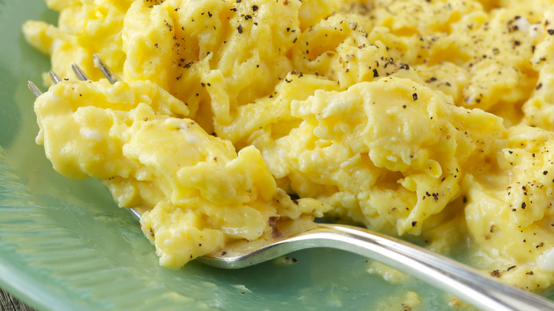 You can prevent this from happening by adding additional ingredients before you cook your eggs, as Gordon Ramsay suggests. Before Ramsay's eggs are cooked, he cubes up pieces of butter and stirs them directly into the mixture (via YouTube). This ensures that during cooking, every piece of egg is coated in creamy fat. While Ramsay's method is designed for the pan, it's also a surefire way to imbue microwaved scrambled eggs with flavor from the inside.