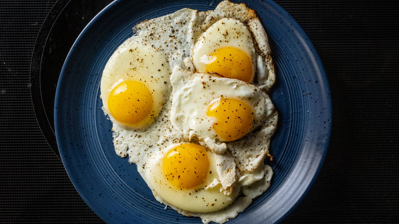 That's why you should always grease your cooking dish before microwaving eggs, per Egg Farmers of Canada. You can do this with pretty much any fat you have to hand, although cooking spray may be the easiest option if you're using a vessel that's small or awkwardly shaped, as you'll achieve better coverage. You can also pour a little bit of vegetable oil onto some paper towel and wipe it around the dish, or use a smidge of butter; remember, adding fat also gives you a chance to add crucial flavor to your eggs. This is especially important if you're making microwaved fried eggs, which rely on additional fat to generate improved texture and that indulgent taste.