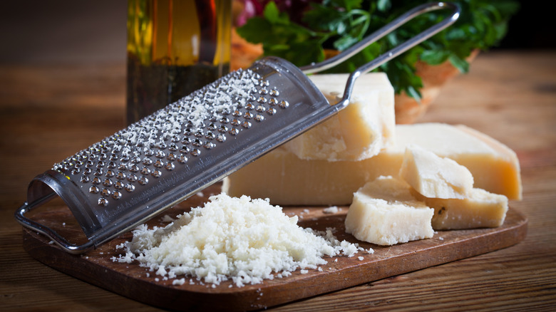 To achieve this, warm up a greased pan on your stove, and then sprinkle some grated Parmesan into the skillet before placing your bread slices on top of them. Once the cheese has melted slightly, place your filling cheese on top of your slices before placing the two pieces of bread together. Proceed to fry your grilled cheese as you normally would on medium-low heat. As it cooks, the Parmesan-studded sides will become flecked with crispy, deeply savory pieces while the inside melts as normal.
