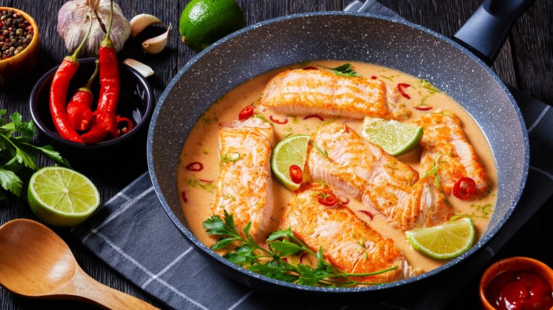 In a similar vein, adding citrus slices to foil or parchment parcels of fish not only adds flavor but also helps to eliminate odors. You can even use acidic ingredients in a sauce to poach your fish. For example, a creamy tomato sauce or coconut milk sauce with zingy lime will make your fish deliciously tender and flaky while also ensuring there's no pesky odor of fish permeating your entire house.