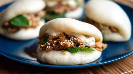 Assembling bao buns involves nothing more than placing a generous spoonful of filling (consisting of a combination of protein and sauce) into the center of the taco-shaped steamed bun. These little beauties can then be garnished with thinly sliced scallions, sliced cucumber, cilantro, shredded carrots — whatever you have on hand to provide a crisp crunch and herbaceous flavor.