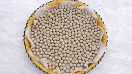 You'll want your pie dough to be sufficiently chilled before rolling it out and blind baking. If your pie crust dough is too warm, it will be soft and subject to butter leakage and shrinkage. The key to a good blind bake is to ditch the parchment paper and use aluminum foil. Aluminum fits the contours of your pie crust more smoothly than parchment paper, and also helps the pie crust retain its butter while baking, helping to make the crust more flaky. Aluminum is great for preventing too much browning on your crust and conducts heat evenly.