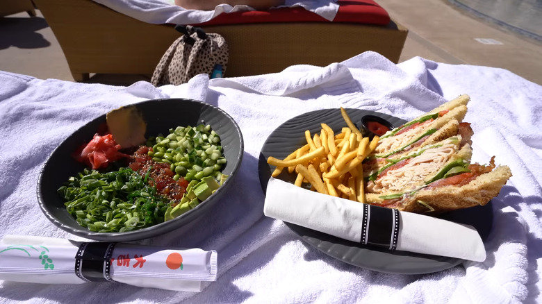 There are several tables located near both the pool and bar where guests can enjoy their food. This is standard bar fare and includes nachos, chicken wings, and tacos. Although it's nothing too exciting, previous guests have been impressed with the food's quality as exemplified by the following Yelp review: "We ordered the miso salmon bowl, Mac and Cheese bites, a couple of burgers and the strawberry shortcake for dessert! [...] It's not fine dining by any stretch but all the dishes we had were tasty and satisfying."