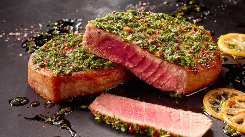 If you often cook fish at home, you're probably no stranger to bringing some big, deep red tuna steaks home. You remove them from the packaging and give them a good rinse in cold water before drying them with paper towels and, say, searing your tuna with olives and capers. You were likely taught to do this, with the idea that it's the best way to clean raw meat. In fact, washing tuna steaks (or any animal protein, really) prior to cooking is a terrible idea that does nothing in terms of removing harmful bacteria from the meat's surface. What actually kills the bacteria that causes food poisoning is cooking the food to a safe internal temperature.