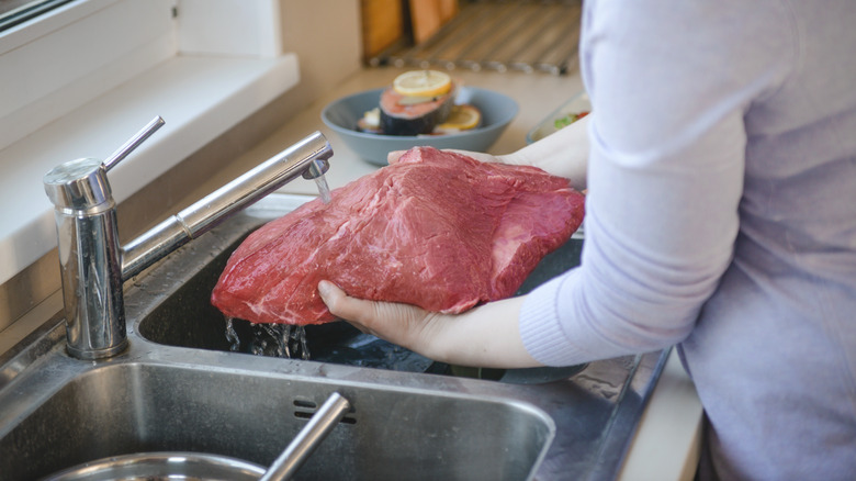 What rinsing off raw meat will do — and quite effectively, at that — is spread any bacteria present all over your prep area. It can travel as far as a three-foot radius around your sink (which, if you wash dishes by hand, has pretty grim implications for any plates or utensils sitting in an adjoining rack). Cold water can't sanitize anything, but it's super-great at cross-contamination as it creates tiny droplets that act as aerial bacteria taxis. It makes you wonder why anyone still washes meat before cooking it.