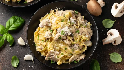 A good way around this is to employ a creamy condensed soup. It may come as a surprise, but condensed soups like cream of mushroom are fairly low in fat, compared to regular cream. A ½ cup of Campbell's cream of mushroom, for example, has 7 grams of fat and just 1 gram of saturated fat. Despite this, it doesn't compromise on flavor or texture, making it the perfect option for this velvety sauce. You just add in the soup at the same time you normally would the cream, mixing your cheese and a bit of milk in simultaneously and cooking together until bubbly. Remember that soups like cream of mushroom are versatile, so you can use them as the base for non-mushroom-based Alfredos, like chicken or shrimp.