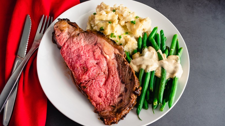 The prime rib is the star of the show, but it isn't the entire show. Side dishes and salads will help to round out the meal. You can keep it traditional and serve the classic sides that usually accompany prime rib, like mashed potatoes or baked potatoes, creamed spinach, and green beans. At the same time, you shouldn't be afraid to buck tradition and try new sides — your guests might just find a new favorite.