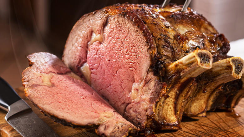 One of the worst things you can do to this quality cut of beef is to overcook it. Prime rib is best when it's cooked low and slow for optimal flavor. Experts recommend roasting boneless prime rib at 350 degrees Fahrenheit for 15 minutes or 325 degrees Fahrenheit for bone-in prime rib. If you try to cook it at a higher temperature, the meat will dry out and overcook. As a general rule, it's better to undercook than overcook. With undercooked meat, you can always put it back in the oven to finish it off.