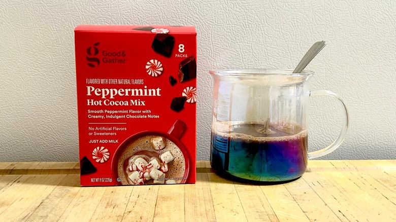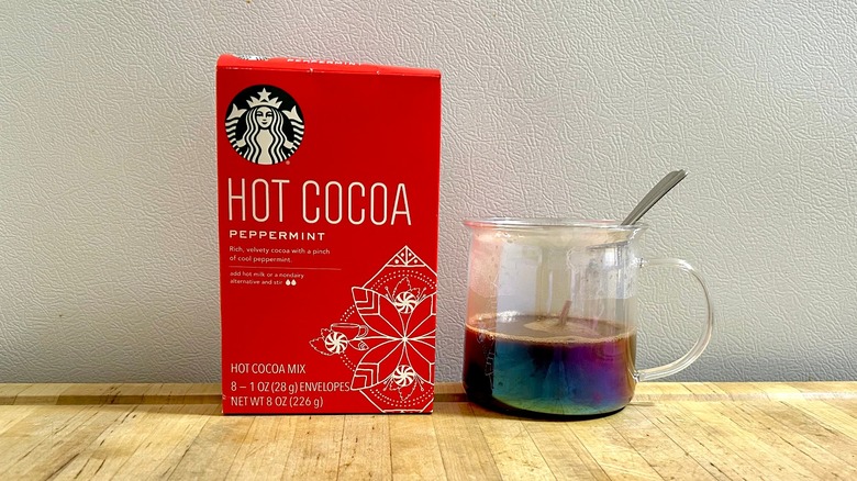 Starbucks may be known for coffee, but its line of hot cocoa mixes is quite popular. This peppermint-flavored mix caught our attention because nothing says Christmas like a hot cup of cocoa with marshmallows. While you can make cocoa using hot water or milk, the instructions on these packets recommend using milk. As a rebel and someone wanting to assess the actual flavor of the blend, I used water.