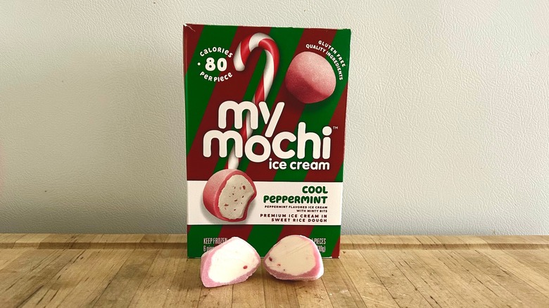 My/Mochi Cool Peppermint is a seasonal flavor that packs all the delicious punch of peppermint-flavored ice cream with candy cane bits and tucks them delicately into a delicate, airy envelope of rice dough for the perfect one-bite sweet treat. Like many of My/Mochi's flavors, the ice cream is not overly sweet and is tempered by the chewiness of the dough.