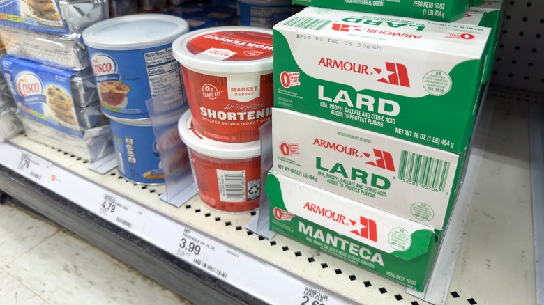 That's where the comparisons end. Among the many differences, lard imparts a subtle but distinct pork taste to food versus the lack of flavor in Crisco. If you like a meaty flavor, that's great, but it could be surprising or off-putting to some — especially in baked goods. Lard also has much more saturated fat with 5 grams per tablespoon, though it does offer some Vitamin D. And if you're on a budget, shortening is generally less expensive and can be stored for longer.