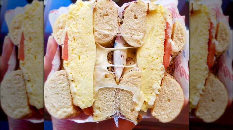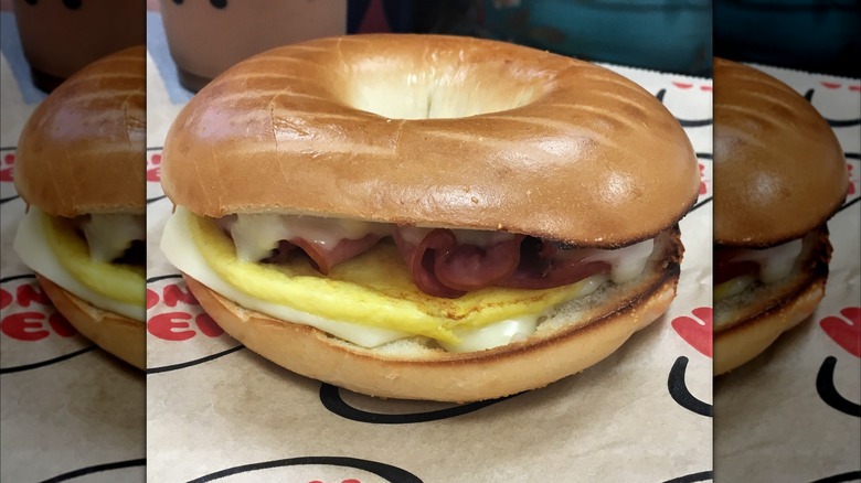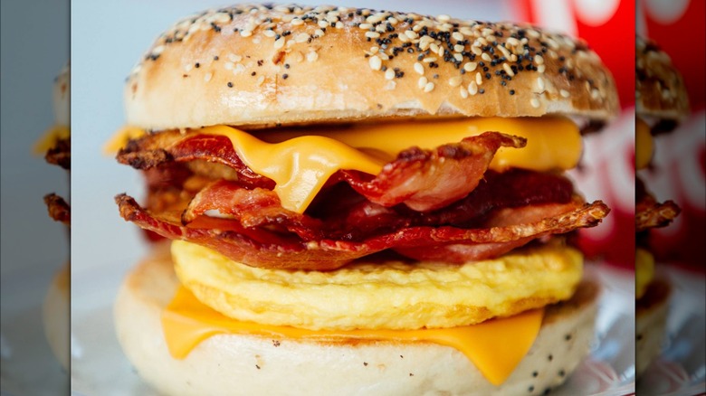 At the same time, what matters most here is the bagel itself — the backbone of a bagel sandwich. Ideally, a bagel should be fluffy inside with a slight chew yet also maintain a lightly baked outer crust. The problem is that it can be difficult to find a good bagel at a fast food restaurant. Fast food bagels can often end up over-toasted, giving them a crunchy texture that's more akin to burned toast. On the other end of the spectrum, some fast food bagels can be overly dense and almost gummy, which also isn't exactly desirable. The good news is that we're here to give you the rundown on which places are worth it.