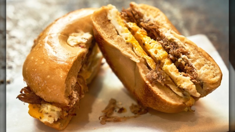 Because Panera is known for its bread — which is of a higher quality than many other fast food chains — Panera is a wise choice when it comes to breakfast sandwiches. Some of the company's bagel flavors include Asiago, Cinnamon Crunch, and Multigrain. The cheese at Panera is also a bit better than many other fast food chains, with options like aged white cheddar that has some nice bite and depth of flavor. The eggs at Panera Bread are folded (similar to McDonald's) yet the eggs have a fresher taste and look to them. If bagels aren't your jam, Panera has other options like brioche buns and baguettes. As solid as Panera is, there are still some other restaurants that truly go the extra mile.