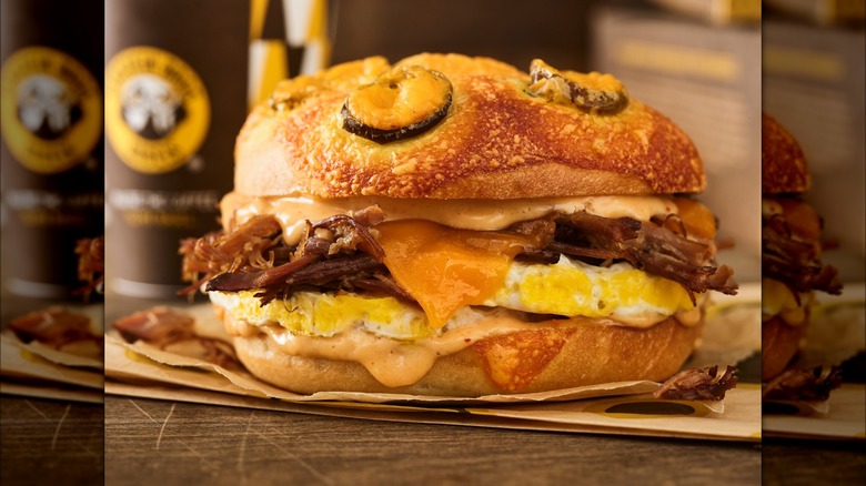 The bagels at Einstein are flavorful and airy, yet also chewy with a light crust on the exterior. The texture has a complexity that many other fast food chains can't hold a candle to. But even beyond sheer texture, the variety and quality of bagel flavors is truly astounding. The company's Green Chile Gourmet Bagel — made with green chiles and a blend of five different cheeses — is every bit as delicious as it sounds. The chiles and cheese are clearly visible throughout the entire bagel, punctuating every bite with a luscious pop of flavor. This bagel is the heart of Einstein's Chorizo Sunrise Egg Sandwich, which comes with cage-free eggs, chorizo sausage, cheddar, smashed avocado, and a schmear of jalapeno salsa cream cheese. All of these ingredients combine on Einstein's Green Chile gourmet bagel to make one of the best breakfast sandwiches we've ever had at a fast food chain.