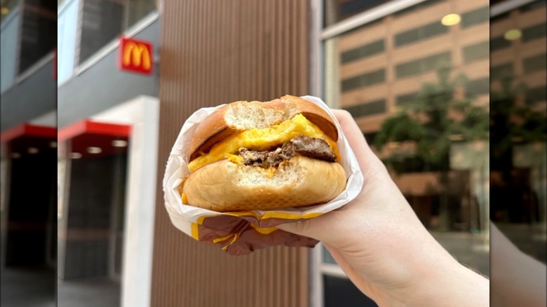 The bagel on McDonald's breakfast sandwich gets good marks for being affordable and consistent. The bagel is well-toasted and comes with a spread of butter. It's thick enough to support the sandwich's eggs and meat without falling apart or getting too messy. That said, the bagel itself also isn't exceptional or flavorful. A bagel breakfast sandwich from McDonald's is designed to quickly get the job done, and in that way, it succeeds. But it's not the kind of food that will induce cravings or daydreams.