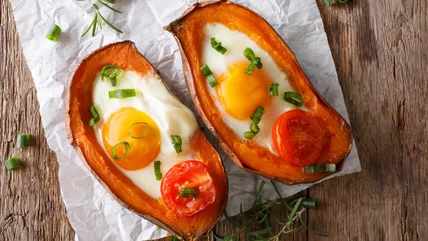 Bust your sweet potato open and cover it like a blanket with a decadent fried egg topped with bacon bits for a familiar, sweet, and savory breakfast. Take those toppings up a notch by including avocado slices, sour cream, plain Greek yogurt, or feta cheese. Sauteed veggies like kale, spinach, and mushrooms can bring an earthy twist to the potato's delicate whispers of sweetness for a well-rounded and complementary flavor profile.
