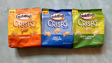 Taking a page, and a shape, from a Swiss cookie she found during a trip to Europe, Pepperidge Farm founder Margaret Rudkin launched the Goldfish cracker in the United States in 1962. Across the following six decades, the beloved Goldfish shape has gained a lot of flavors and been turned into everything from pretzels to sandwich bread. One thing it never has been fully transformed into, though, was a potato chip. No longer. In 2023, Goldfish cooked up a line of baked "Crisps," and they will arrived in stores in three flavors snackers already love: Cheddar, Salt & Vinegar, and Sour Cream & Onion.