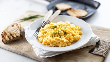Scrambled eggs are a highly versatile breakfast and can be elevated with anything from a simple pat of butter to a healthy sprinkle of pepper jack cheese. Aside from the obvious additions, there are also many unexpected ingredients that go great with eggs. For instance, throw a dollop of cottage cheese into your eggs for some tang, or drizzle on hot sauce for a peppery edge. If you'd prefer a sweeter addition, consider adding a dash of cinnamon to your scramble.
