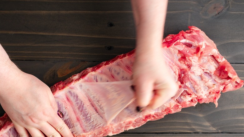 Pork ribs usually come with a shiny white membrane coating their underside. This membrane, though, which acts as a barrier between the meat and bone and the pig's organs, hardly makes for a delicious meal. The rib membrane is chewy and makes eating your ribs challenging, and it also prevents your spice rub from getting to the meat itself, ruining its flavor.