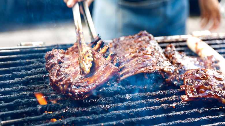 It's also important to be more sparing with your sauce than you think. Pouring sauce straight over the ribs will cause some of it to drip into your grill, potentially causing flare-ups and producing a messy cleanup operation, as well as making things way messier to eat. Remove your ribs and use a brush to lightly daub them with sauce, making sure to cover every edge before you return them to the grill. If they begin to dry out, you can simply add some more — and you can always serve extra on the side of the plate.