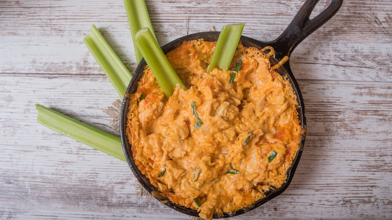 But adding a scoop of mascarpone cheese will take your Buffalo chicken dip to a whole new level. Unlike cream cheese, which is made from whole milk, mascarpone is made from heavy cream, giving it a higher fat content and creamier consistency, as well as a flavor that's less tart and slightly sweeter than cream cheese. Using a blend of these two soft and spreadable cheeses tempers the acidic heat of the hot sauce and results in a Buffalo chicken dip that's smooth, inviting, and opulent — just like every appetizer should be.