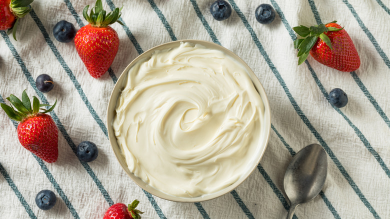 Mascarpone cheese can be found in most supermarkets around the country. Its pale color, creamy texture, and place in the dairy cooler would make one believe that it can be interchanged with other soft cheeses, but mascarpone has a history that's totally its own. Like many gastronomic gems, mascarpone cheese hails from Italy, specifically the northern end of the peninsula, between the cities of Abbiategrasso and Lodi, near Milan. Because it's made from heavy cream, mascarpone has a fat content between 60% to 75%, which is significantly higher than both cream cheese and ricotta, and is actually more similar to butter.