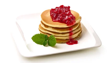 If you enjoy canned cranberry sauce with your holiday feasts, mash the leftover sauce with a fork or break it down in a food processor with some water to give it a spreadable texture. Canned cranberry sauce is often sweeter and less tart than its homemade counterpart. If you want a hint of tanginess to your pancakes, consider squeezing a small amount of citrus juice into the mashed canned cranberry sauce to give it a homemade taste, while also helping it become more spreadable. From there, just pour your sauce onto a stack of hot flapjacks, or spread the sauce between each pancake before stacking them.