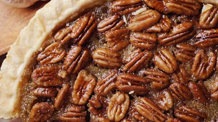This is why you want the middle to be jiggly when you take your pecan pie out of the oven: The filling's sugars are still a little liquified and will set as they cool. Lightly pressing on the center of the pie is a nearly foolproof way of testing if the filling is sufficiently baked. The filling in a pie that's baked will spring back when pressed; the middle of an underbaked pie will cave in under the pressure — and that pie is likely to have a runny filling and soggy crust. If there's no give or spring at all to the middle of your pecan pie, it's likely overbaked and the center will be more like a crumbly cookie than a luscious sugar pie.