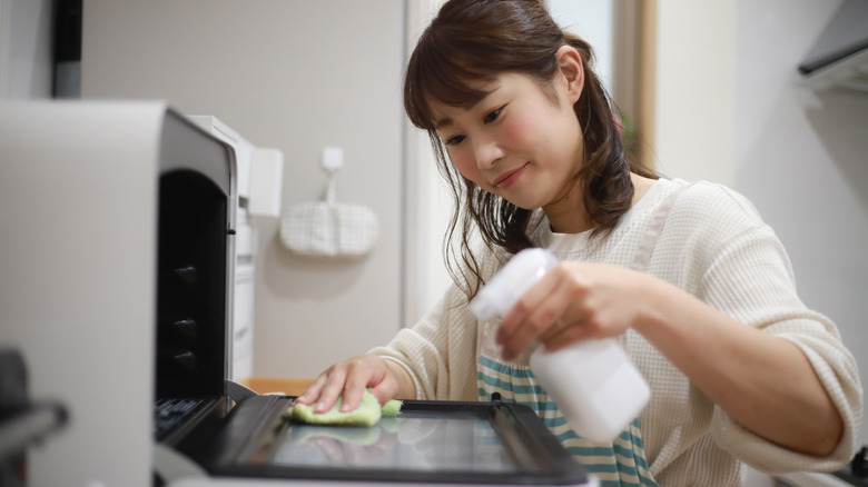 While you might be tempted to get a heavy-duty piece of steel wool to scrub out the stuck-on grime inside your oven, this will likely damage the material of your oven and scratch up any non-stick coating. You'll want to grab a microfiber cloth, kitchen towels, an old rag, or any other non-abrasive cleaning tool, soak it with a cleaning solution, then carefully wipe down the interior walls. You can use an all-purpose cleaner or a homemade mix of vinegar, dish detergent, and warm water. Make sure you apply the cleaning solution to your cloth instead of spraying it inside the oven and wiping it down — you'll want to avoid getting any cleaning solution on the heating elements as much as possible.
