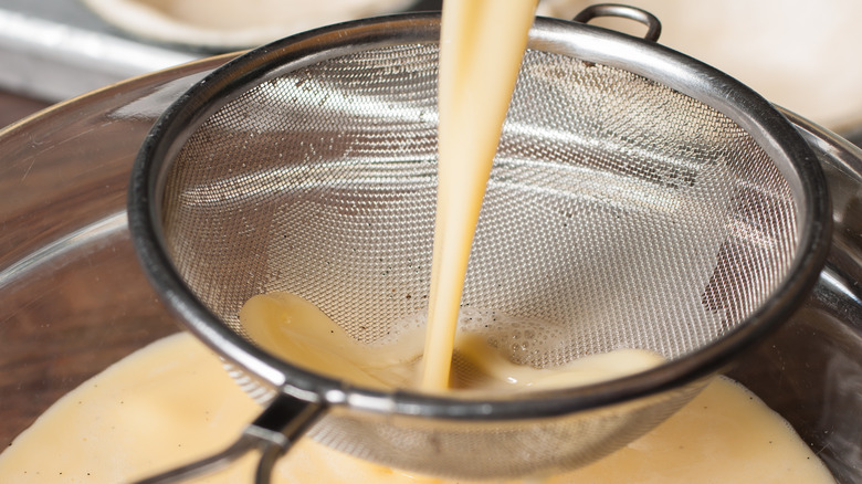 Even the best whisking can still come up short, however, and that's why it's important to strain pastry cream. The best and only time to strain it is when it's hot off the stove, because once you turn off the heat the sauce will start to thicken and you'll never get it through a strainer. To make sure you're not searching around the kitchen for a strainer when the sauce is hot, set up a straining station before you even turn the heat on the stove. This setup only needs to be a fine mesh strainer or a colander that has lots of small holes, and a large heat-safe bowl. It's a bonus if the strainer fits on top of the bowl so that you don't have to hold it in place when you pour the pastry cream into it.