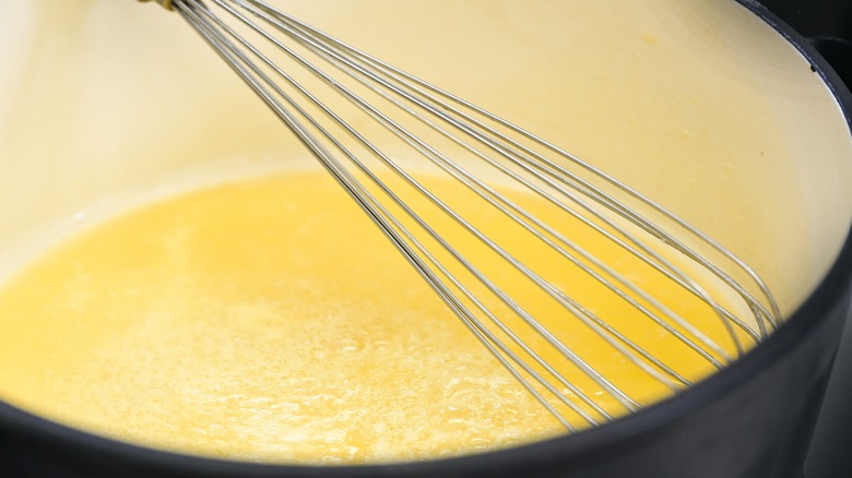 Pastry cream is a custard, which means that it's a liquid that's thickened by cooking eggs or egg yolks in the mixture. However, pastry cream also has a flour or cornstarch base, which also thickens the sauce, just like a bechamel or gumbo. The combination of thickeners gives pastry cream its signature texture, however, these two thickeners also create ample opportunity for lumps to form in the pot. It's important to always use a whisk when you're stirring the ingredients on the stove, and never walk away while the heat is on because it will cook unevenly.