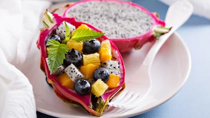 Cubed dragon fruit mixed with diced cucumber, mint, and lime juice makes for a delicious fruit salad. On the savory side, incorporate dragon fruit into a salsa by combining it with tomatoes, red onions, cilantro, and a splash of balsamic vinegar for a unique topping for grilled fish or tacos. And why not go ahead and serve your culinary creations in the fruit's biodegradable shell?