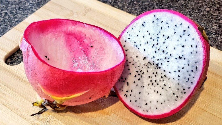 Using dragon fruit skin as a dessert bowl can add a visually stunning and eco-friendly touch to the presentation of your favorite sweet treats. It's a biodegradable vessel, so it's perfect for parties and large gatherings where you don't want to wash a massive load of dishes. Goodbye, single-use plastics, and hello environmentally-friendly dessert bowls. Plus, the vibrant magenta and yellow hues of the fruit's skin create an appealing backdrop for colorful desserts, while simultaneously imparting the sweets with a subtle, fruity aroma — functional beauty for the win! Dragon fruit skin is also perfectly edible, and actually offers a host of vitamins, antioxidants, and fibers. Just be sure to wash the fruit thoroughly before using the skin as a bowl, especially if you plan to eat it afterward.