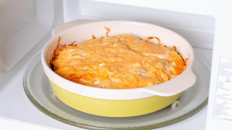Fortunately, with the help of a different appliance, your scalloped potatoes can be done much quicker. Simply grab a microwave-safe dish, arrange your sliced potatoes, and top them off with butter, flour, milk, and your preferred seasonings. Once the dish is ready, microwave it in 5-minute intervals, stirring in between. You'll know the potatoes are done when they're soft enough to stick a fork into smoothly. This will likely be around 20 minutes, which is just a fraction of the time they'd need in the oven.