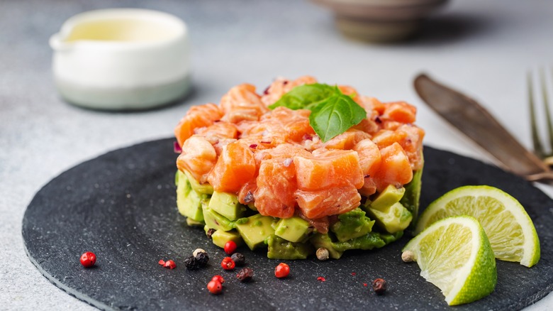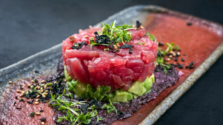 Beef tartare is known for its rich and meaty taste and texture. However, if you're looking to switch things up and experience the flavors of the sea, then you may want to consider making tuna tartare (or why not both for some surf and turf). The dish was invented by Japanese chef Shigefumi Tachibe in 1984. Like its land cousin, tuna tartare features raw meat, in this case tuna. The dish is made with sushi-grade tuna and avocado, chopped up and combined with various sauces and seasonings such as chile, ginger soy, and lime juice. The dish is perfect for those who love their sushi without all that rice and seaweed wrapping.