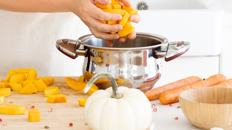 If you're concerned that the beer will turn your wholesome pumpkin soup into a high-calorie dish, don't worry — cooking with beer can provide some nutritional benefits if done correctly. According to nutrition expert Toby Amidor, M.S., R.D. (via Self), "A 12-ounce bottle of regular beer has about 150 calories, but if you examine it closely... you will find it contains a multitude of B vitamins, magnesium, phosphorus and selenium, among others, so beer is not just an empty calorie food." Amidor also explains that food tends to lose nutrients when heated, "but with beer those will uphold because the alcohol will dissipate first."
