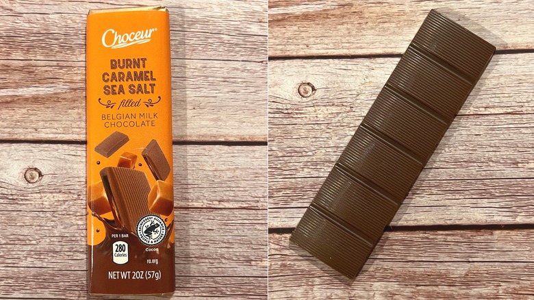 Up next on the list is Choceur's Belgian Milk Chocolate with Burnt Caramel Sea Salt option, presenting a flavor profile that doesn't quite work. The packaging promises a combination of burnt caramel and sea salt, but the execution left much to be desired.