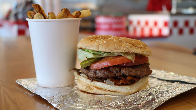 The burgers at Five Guys are definitely a little messy and greasy in the best way possible. The menu isn't overly complicated, but the food the kitchen pumps out is deeply flavorful and perfectly seasoned. The burgers have a somewhat smashed texture that gives them a light crust but a juicy interior. The fries are made on-site with fresh potatoes, which gives them a more natural flavor. The restaurant also offers lettuce-wrapped burgers for those with certain preferences or dietary restrictions. But unlike other chains that offer this option, the lettuce-wrapped burger at Five Guys feels heftier and better assembled.