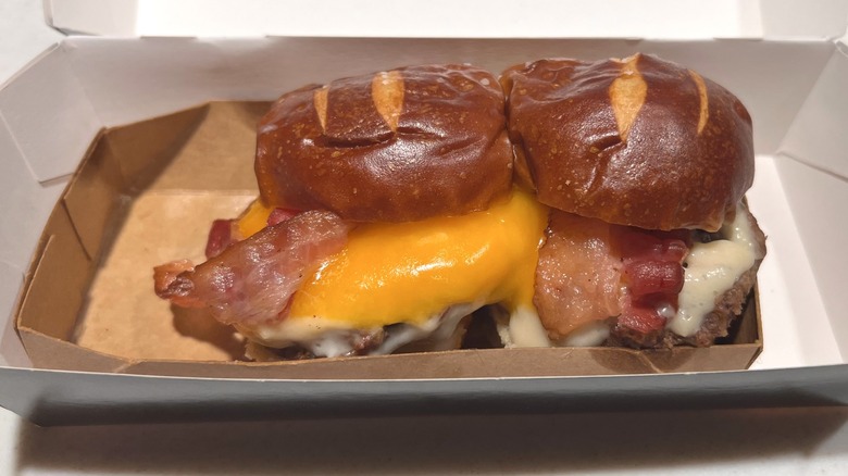 While the soft pretzel bun by King's Hawaiian is a nice twist here, it sort of takes away from the promised namesake item. That aside, the real issue here is the soppy onions, which taste like a sweet relish that would be more at home on a hot dog than a burger.