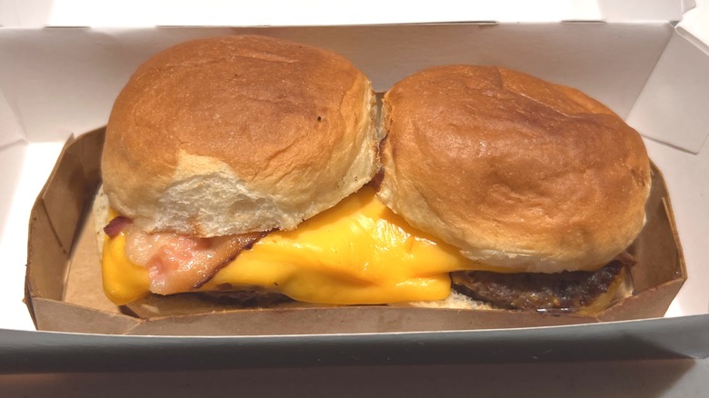 Simplicity is a recipe for success in life, and the same is true when it comes to AMC's sliders. Out of the three options available, the bacon cheeseburger sliders are the one with the least amount of accouterments, which serves it and the diner well. American cheese, a couple of pieces of that limp bacon, and a small amount of Thousand Island dressing top each burger. In lieu of an unnecessary pretzel bun, these sliders are served inside a plain old brioche bun made by King's Hawaiian.