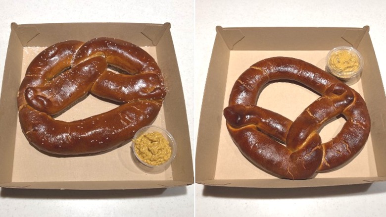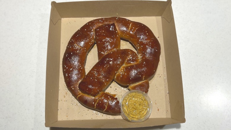 Before I start expounding how great the Bavarian Legend Pretzel is, let's talk about the elephant in the room — its nutritional values. With a side cup of cheese and one of brown mustard, the salted pretzel comes in at a whopping 1,940 calories and contains 7,610 milligrams of sodium. Just reading those numbers alone calls for an extra large icy soda to wash away that news.