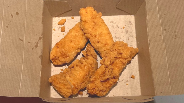 The outside of the tenders have a flaky shell, in a way that resembles the batter coating of fish & chips. The skin's thickness also helps to keep the juicy white meat on the inside retain a semblance of warmth, which serves it well for longevity.